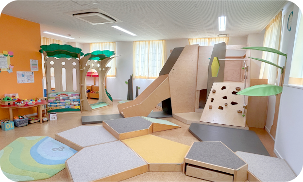 白鳥こども園に併設されている子育て支援センターです。「フォレスト・森」がテーマになった遊び場は、木々や草などをモチーフにした遊具が揃っています。
